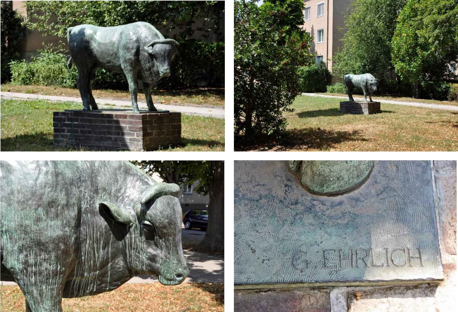 Georg Ehrlich erhielt 1959 von der Gemeinde Wien den Auftrag für die Plastik „Großer stehender Stier“, die sich seit 1960/61 in der heutigen Aufstellung beim Kindergarten des „Helmut Qualtinger
